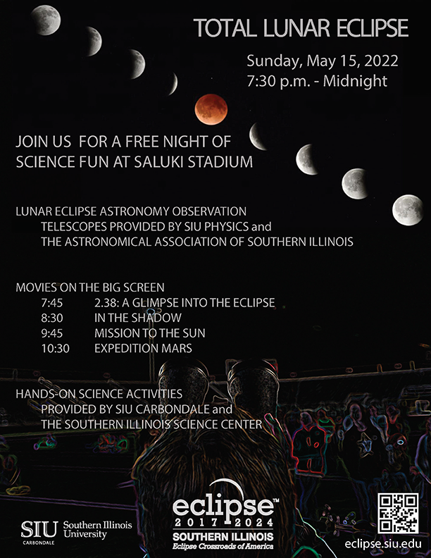 Join SIU Carbondale, the Astronomical Association of Southern Illinois, and the Southern Illinois Science Center to experience a Total Lunar Eclipse on Sunday, May 15, 2022 at Saluki Stadium on the SIU campus. This free event will include guided telescope observations, science activities, videos, and movies on the stadium big screen. The south stadium gates will open to the public at 7:30pm with events starting at 8pm and continuing through midnight. Free event parking will be available at the Banterra Center (SIU Arena) parking lot, #18.