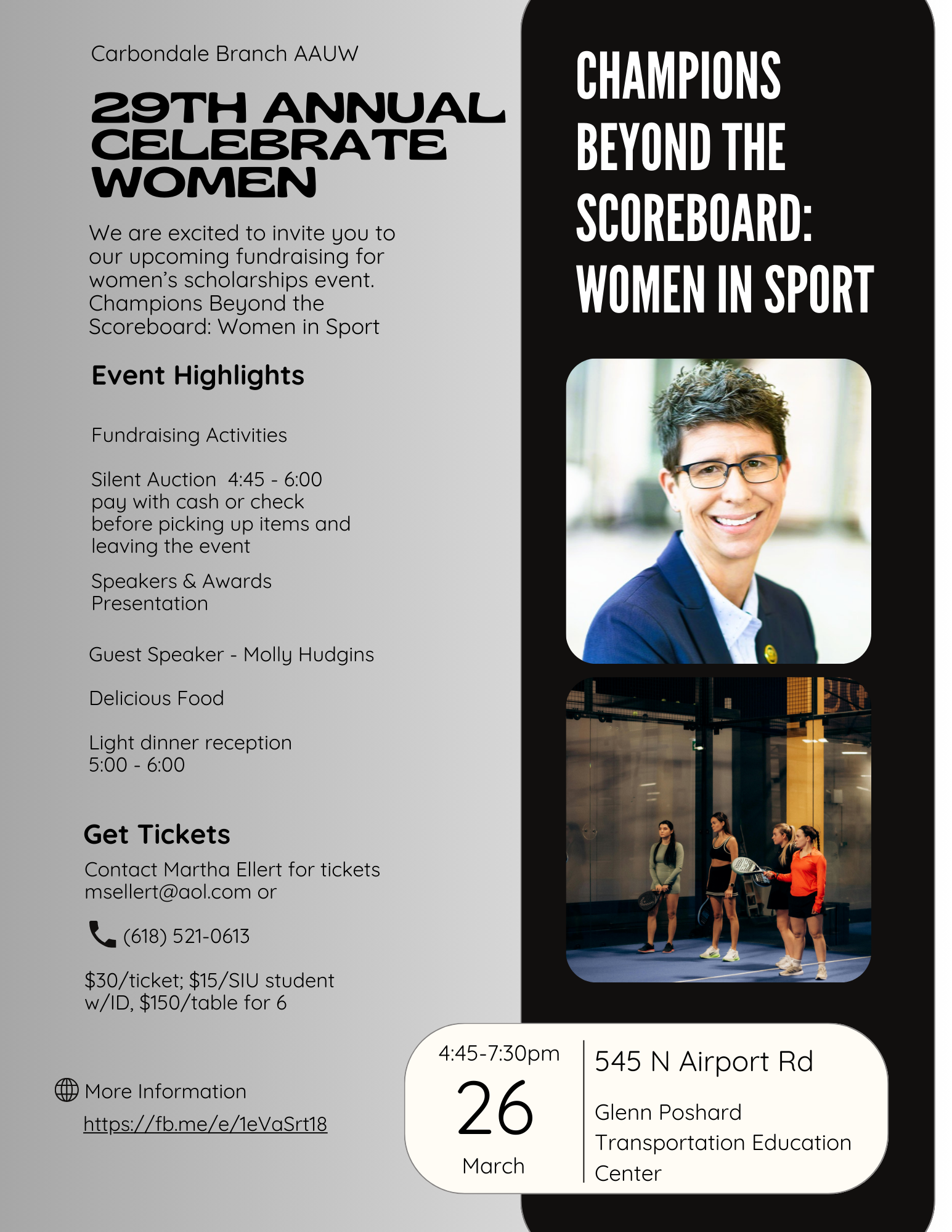 Molly Hudgins, executive director of the SIU Alumni Association, will be the guest speaker. The event will include awards presentations, a light dinner and more. It begins a 4:45 p.m. and takes place at the Glenn Poshard Transportation Education Center, which is in the Southern Illinois Airport. Tickets are $30 and can be purchased from msellert@aol.com